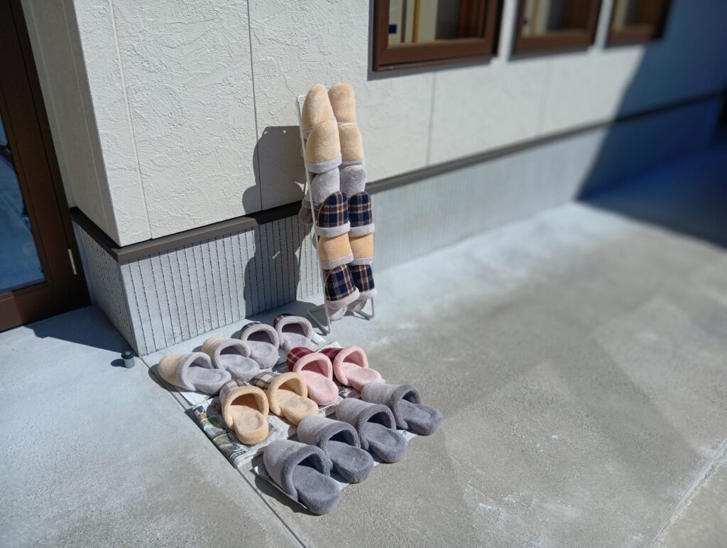 お天気を見計らって、スリッパを干します。